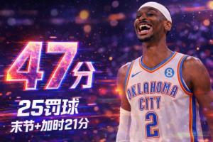 本场比赛,亚历山大出战41分钟,投篮19中12,三分3中2,罚球25中21超活塞全队(23罚),拿到47分5篮板3助攻2抢断。