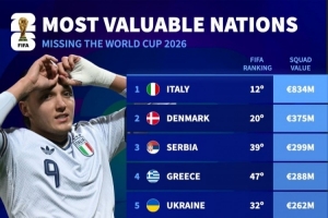 体育资讯4月2日讯 德国转会市场列出了无缘世界杯球队身价排名,意大利8.34亿欧居首,丹麦、塞尔维亚二三位。