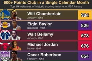 (注:上图仅统计单人的最高纪录、如张伯伦个人984为最高,但还有多次900+、800+、700+、600+)