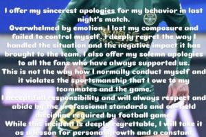 我为自己在昨晚比赛中的行为致以最诚挚的歉意。