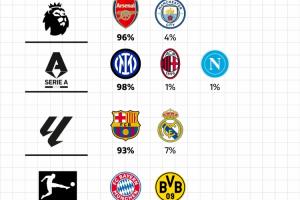 体育资讯04月06日讯 欧洲五大联赛已经接近赛季尾声,数据网站Football Rankings根据联赛分数、近期状态、剩余赛程等因素,列出了各联赛球队夺冠概率,五大联赛领头羊夺冠概率都超过了90%。
