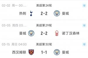 最近3次掉链子,曼城刚好是送给保级队每队1分,他们2-2战平第16热刺,2-2战平第17森林,1-1战平第18西汉姆。